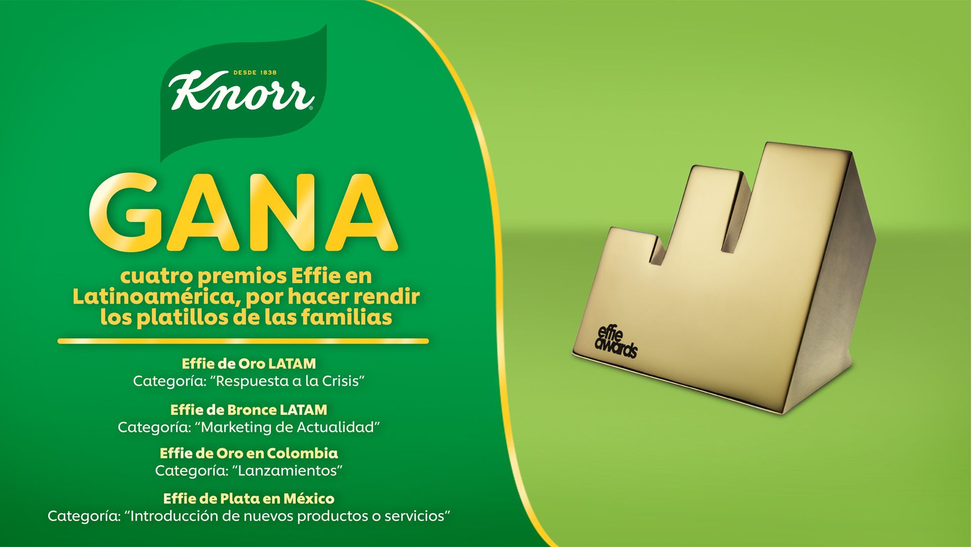 Durante el anuncio de los Effie Awards Latinoamérica realizados ayer, Knorr se llevó Effie de Oro en la categoría “Respuesta a la Crisis”, además de un Effie de Bronce en la categoría “Marketing de Actualidad”. Cabe destacar que recientemente esta misma campaña obtuvo Effie de Oro en Colombia en el apartado de “Lanzamientos”; así como un Effie de Plata para México en la categoría de “Introducción de nuevos productos o servicios”, respectivamente.