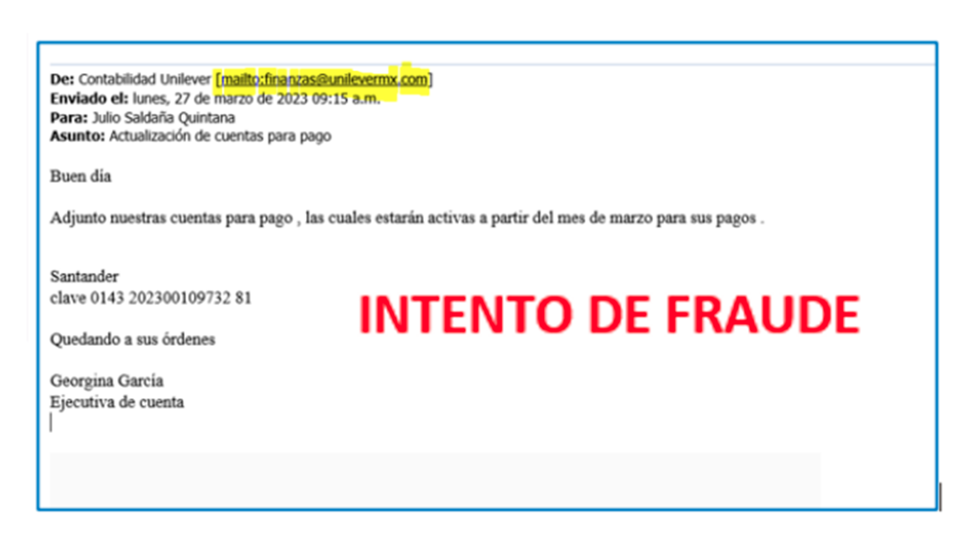 Unilever de Mexico no ha hecho ningún cambio en sus cuentas bancarias y/o referencias usadas para hacer pagos, además, la dirección de correo electrónico que utilizan NO corresponde al dominio que de nuestros colaboradores ni cuentas corporativas.